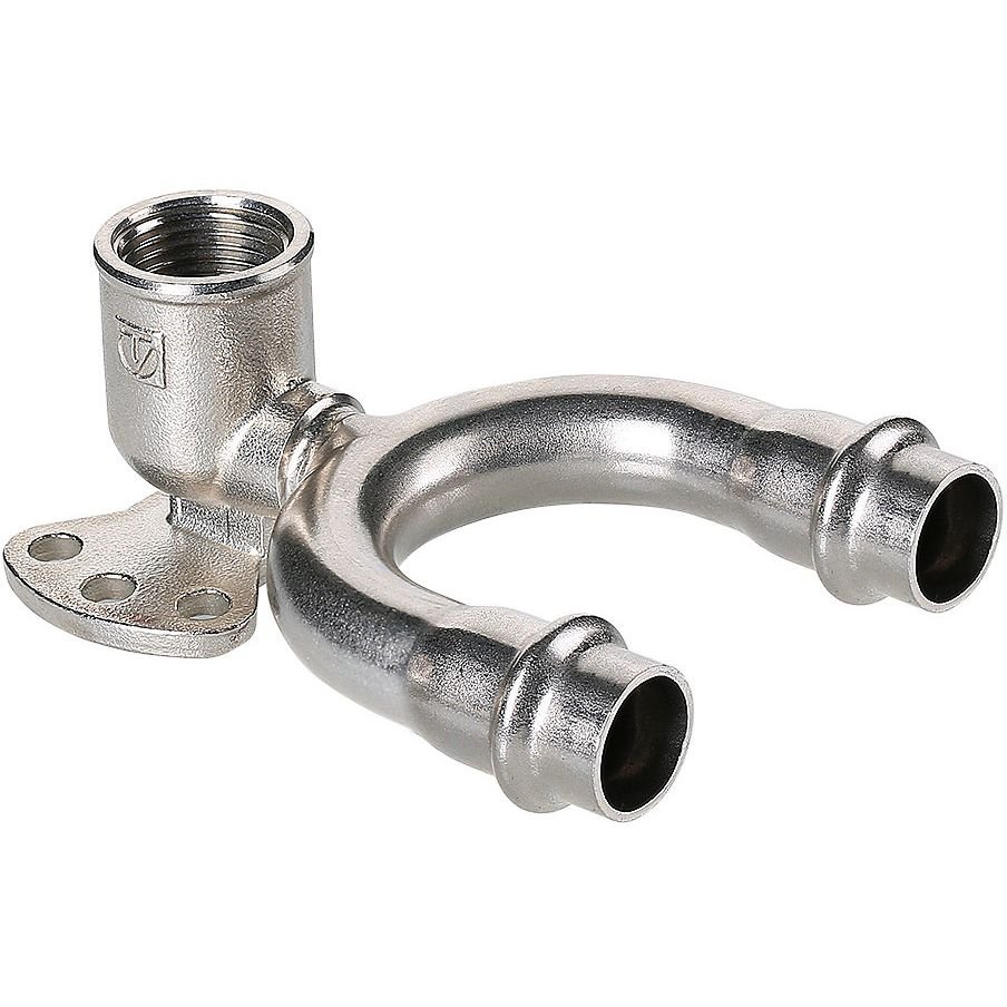(VTi.954.DI) Проходная водорозетка в системе INOX-PRESS представляет собой U-образный тройник с угловым переходом на внутреннюю резьбу в центральном отводе и креплением.